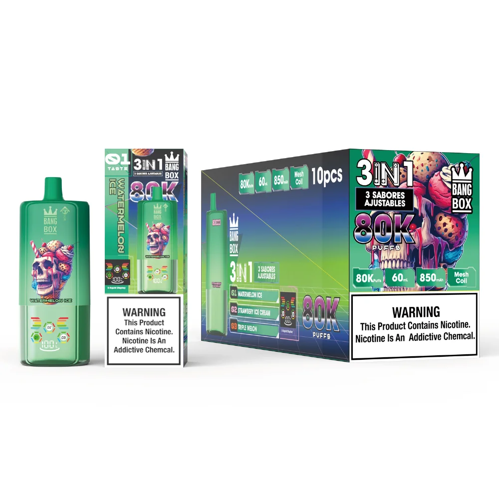 Bang Box 80000 Puffs es un vape desechable de alta capacidad con un interruptor de sabor rotatorio 3-en-1. Cuenta con una capacidad de e-líquido de 60ml, bobinas de malla triple y una batería de 850mAh. El dispositivo incluye un diseño de calavera genial y una ventana inteligente para monitorear los niveles de batería y líquido.
