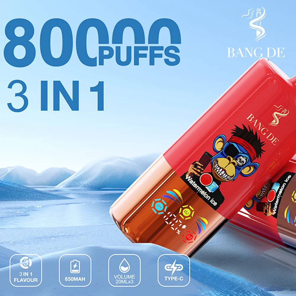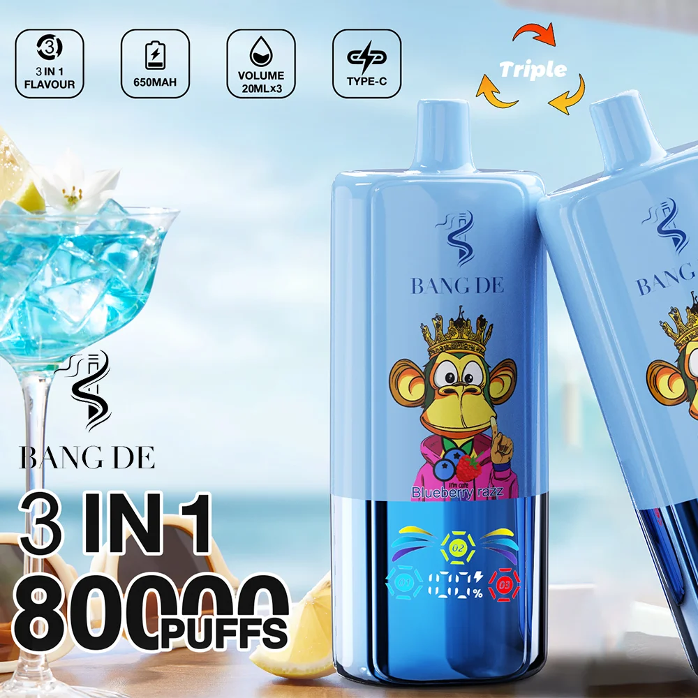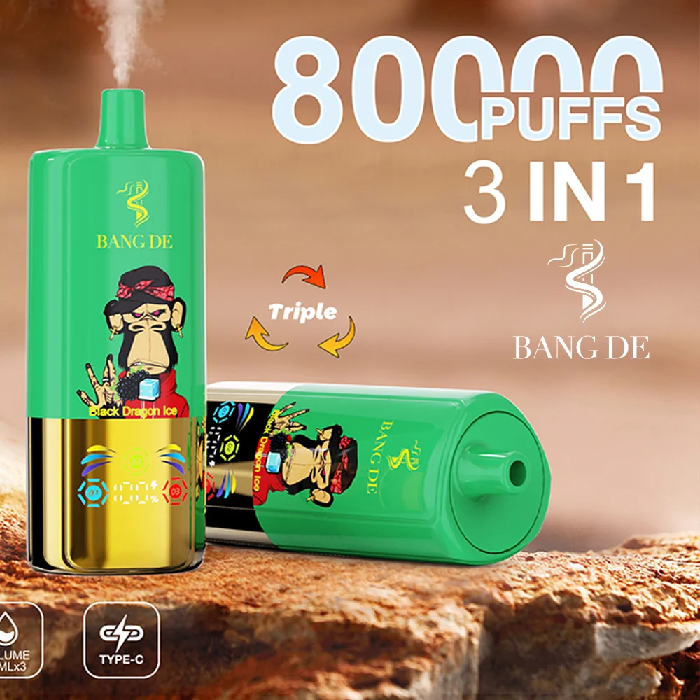 El vape desechable Bang DE Triple 80000 puff presenta un único interruptor de sabor giratorio 3 en 1 y un icónico diseño de mono.