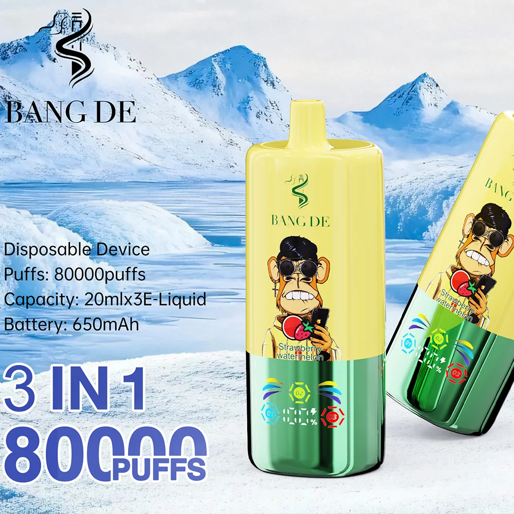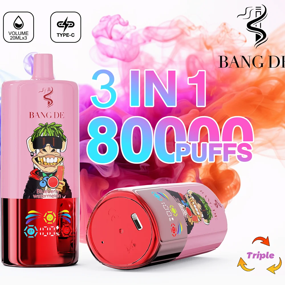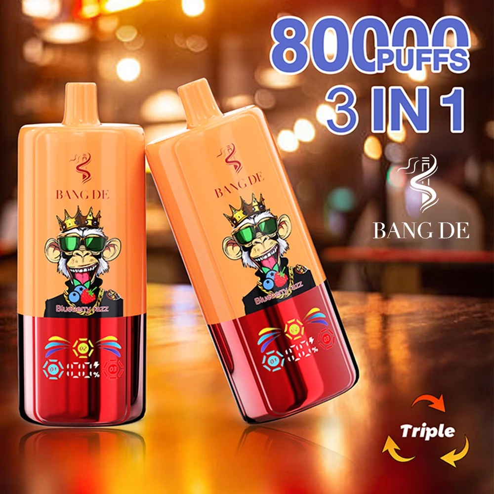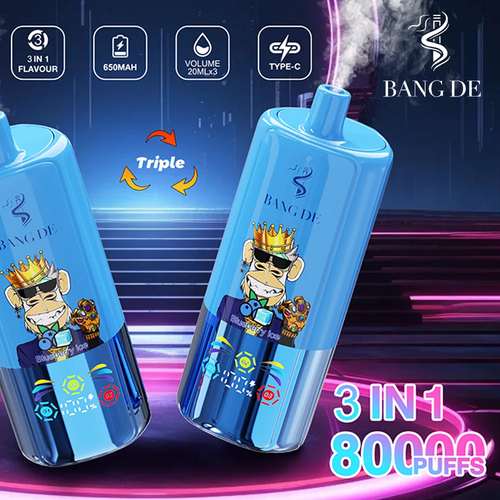 El vape desechable Bang DE Triple 80000 puff presenta un único interruptor de sabor giratorio 3 en 1 y un icónico diseño de mono.
