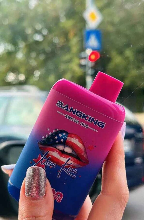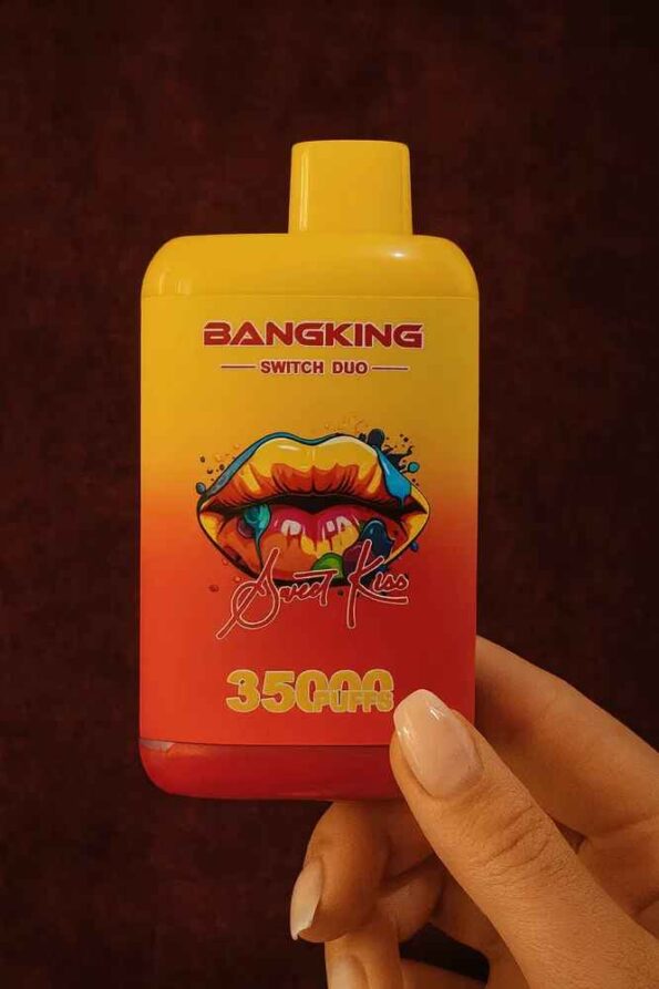 Bang King Switch Duo vaper desechable de 35.000 caladas es un cigarrillo electrónico desechable de doble sabor que ofrece 35,000 caladas, una batería recargable de 650 mAh y 12 emocionantes combinaciones de sabores. Presenta un diseño único con forma de labio y colores vibrantes.