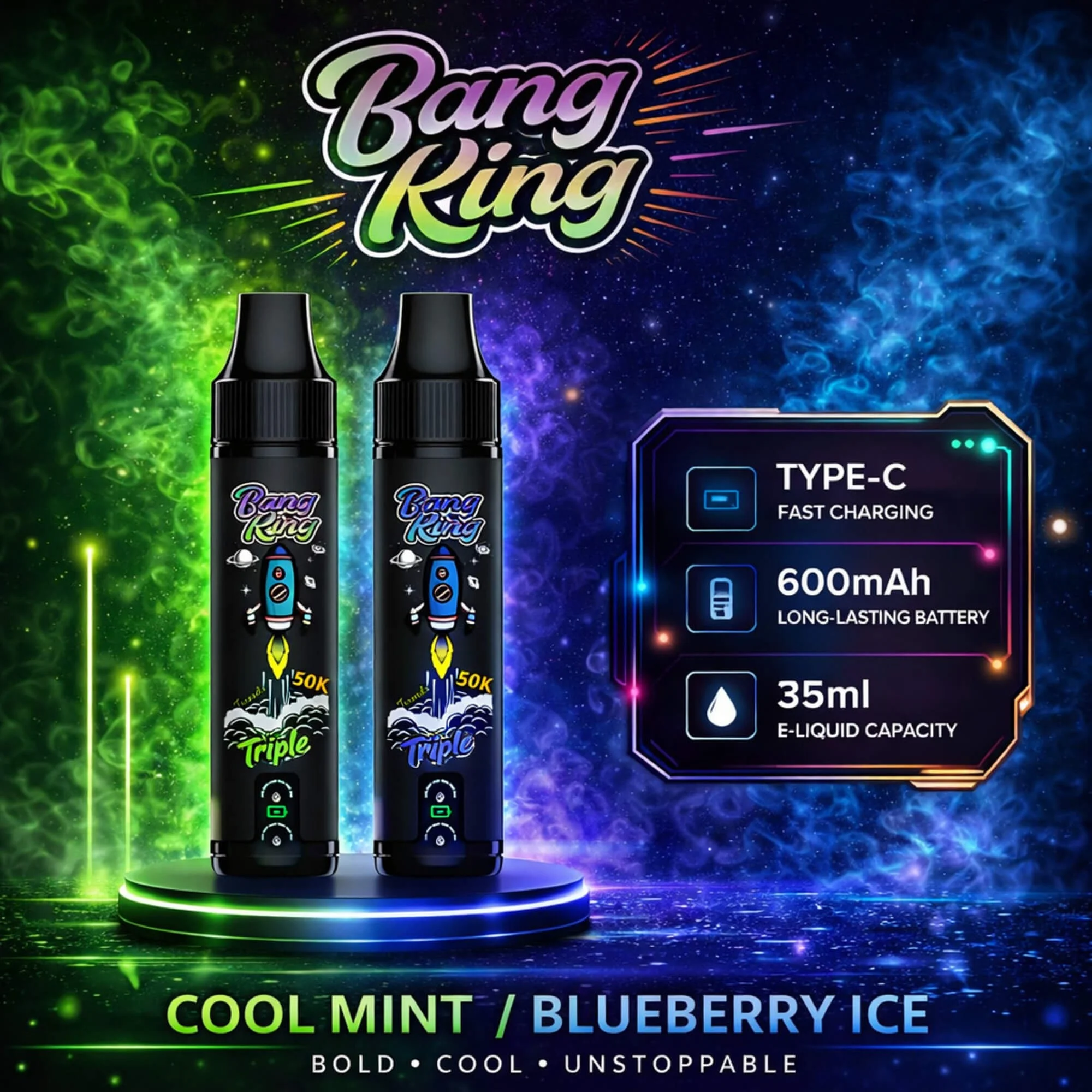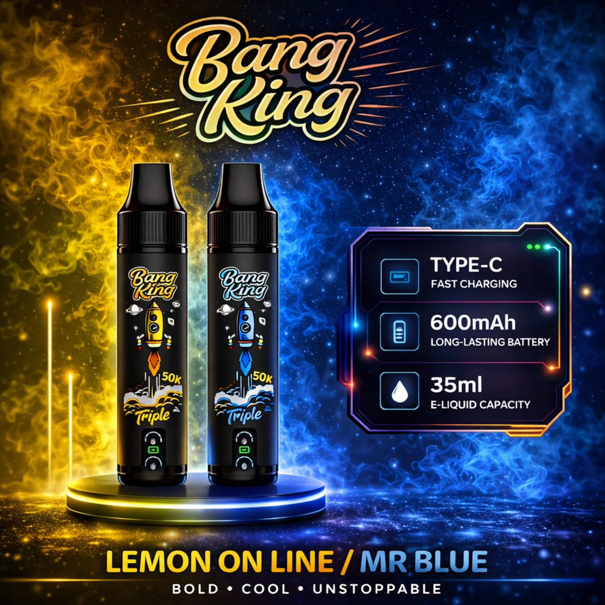 El Bang King Triple 50000 Puffs es un vape desechable de alta tecnología con un exclusivo interruptor de sabor inteligente. Permite a los usuarios disfrutar de dos sabores separados o una mezcla combinada A+B simplemente tocando la base. Con bobinas de malla dual de 1.0Ω y una batería Type-C de 600mAh, ofrece nubes densas y un viaje de sabor personalizable 3 en 1 para los vapeadores europeos.