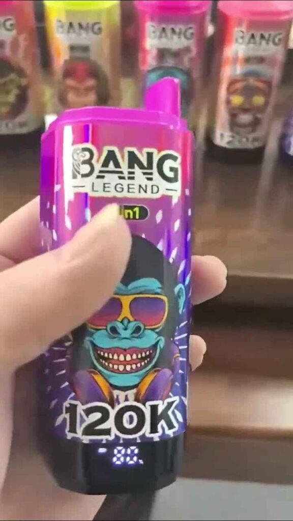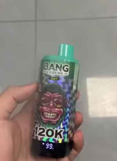 El Bang Legend vaper desechable 120K caladas 5 en 1 que ofrece 120.000 caladas y múltiples sabores. Cuenta con una boquilla giratoria fácil de usar para cambiar de sabor y una pantalla que muestra los niveles de batería y e-líquido.