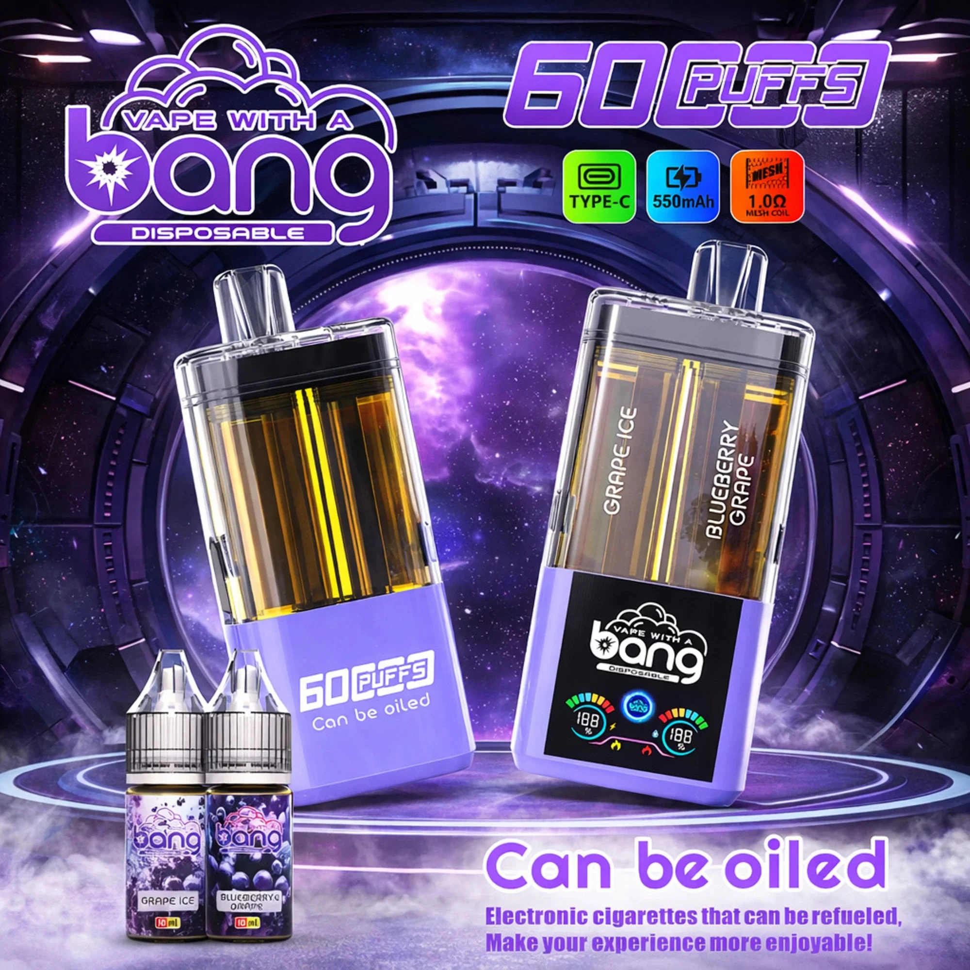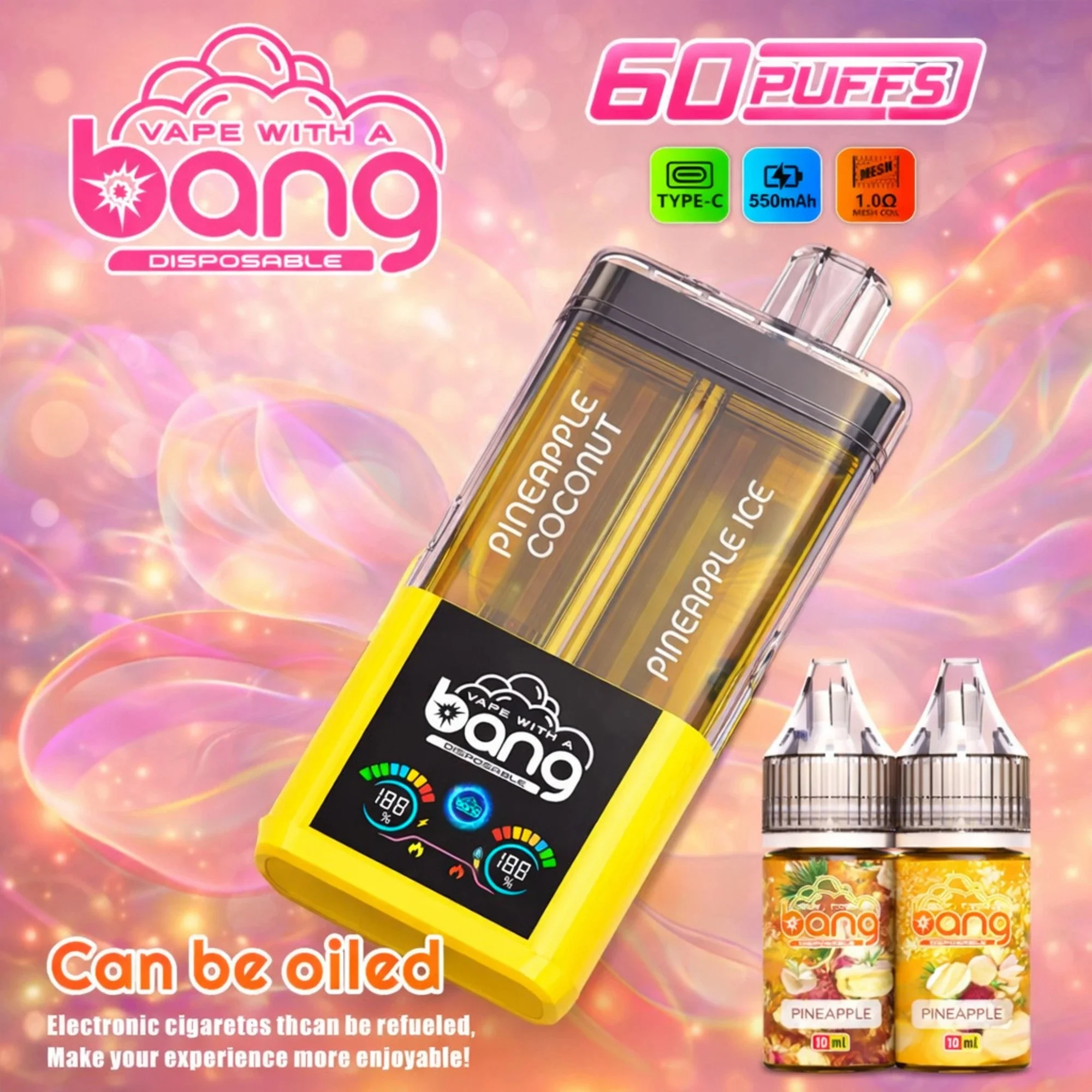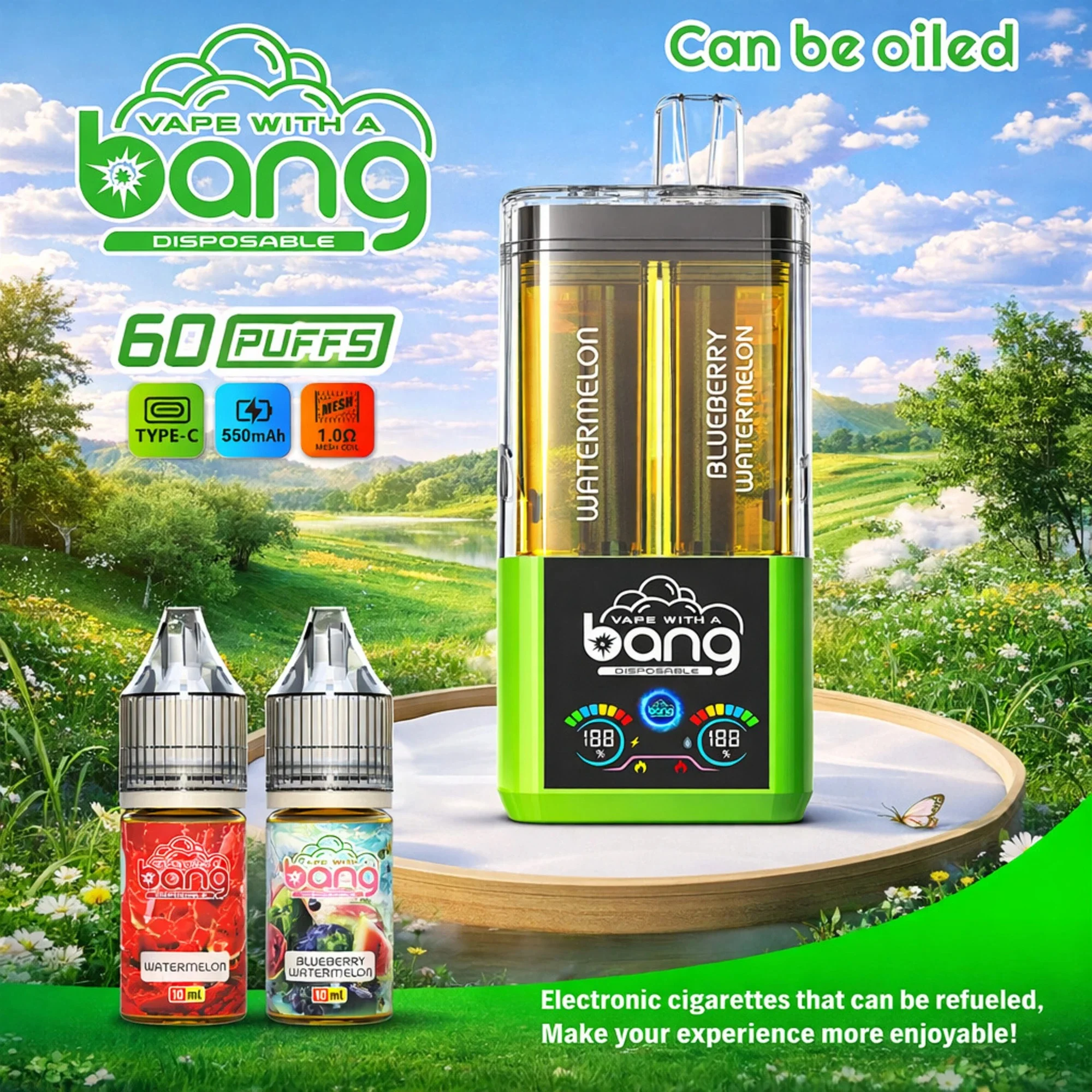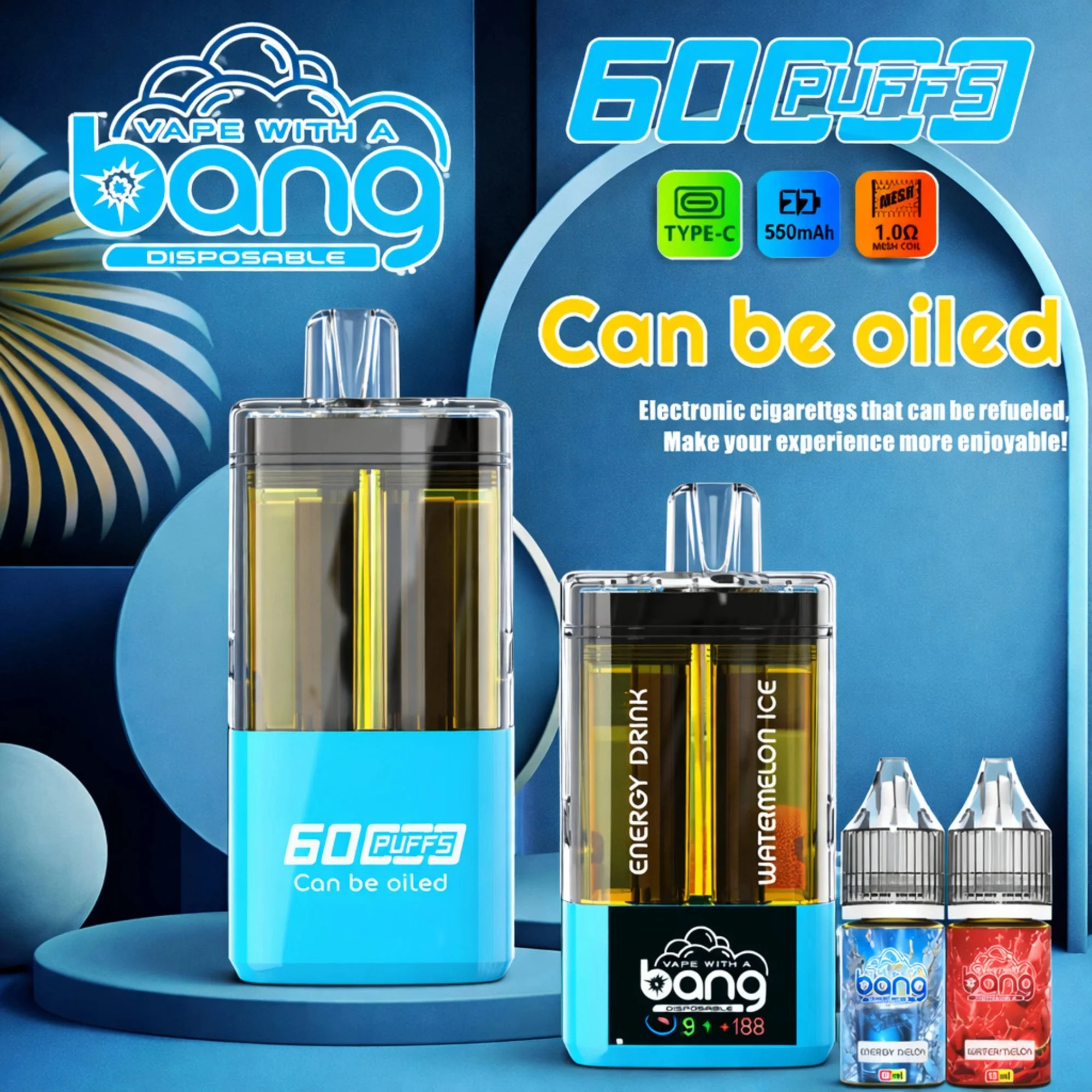 Bang Vape 60000 Puffs Desechable Vape | 2-en-1 Sabores Tanque Transparente Recargable | 60K Vape LED Pantalla Inteligente